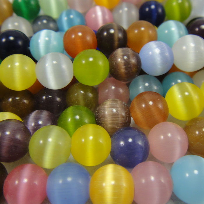 Glass Cat’s Eye beads are a man made bead created using fiber optic glass which, is usually used in the telecommunication industry. For this reason Cat’s Eye beads are also known as “Fibre Optic Beads”. These remarkable semi-translucent beads are composed in the way to create an amazing light refraction effect that shimmers with movement.