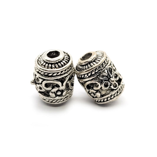Pack of 2 antique silver colour, Tibetan Style Drum Beads. Approximate Size: 14x10mm, Hole Size: ~3mm