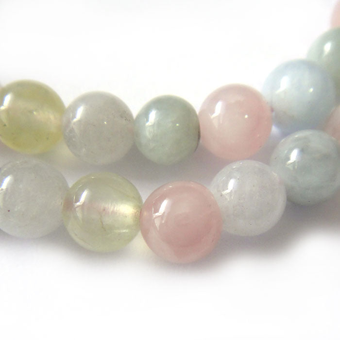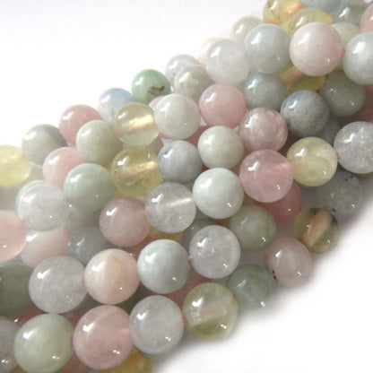 These strands contain beautiful rare natural pale pink Morganite mixed with other pale shades of Beryl beads including Aquamarine and Heliodor.