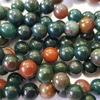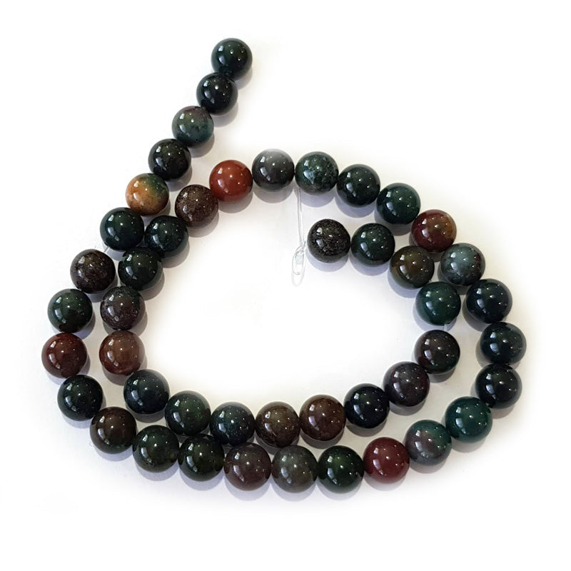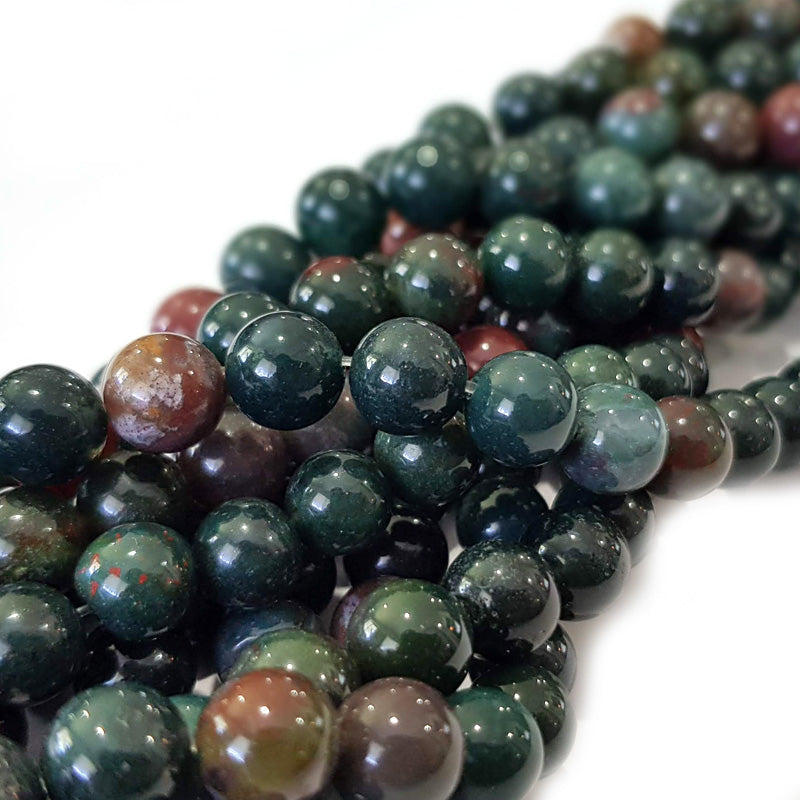 These beads, sometimes called heliotrope, are deep forest green with attractive contrasting red markings. The myth is that, at his crucifixion, the blood of Christ fell on Green Jasper.