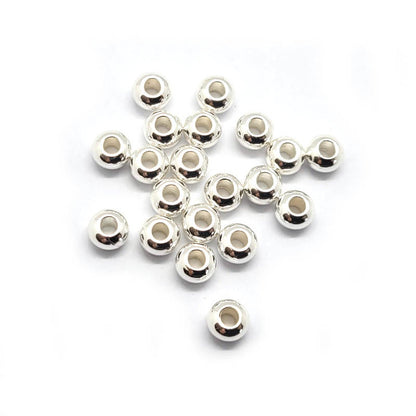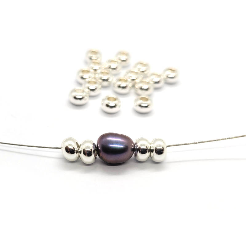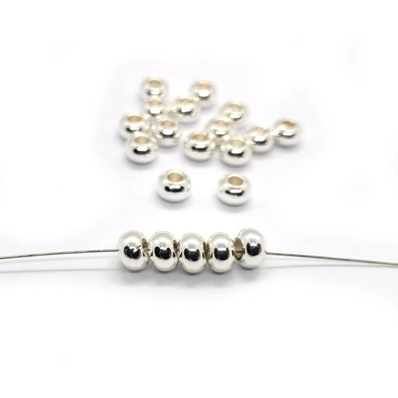 Pack of 20 Silver colour brass rondelle shaped beads. Size: 6x4mm round, hole:2mm.