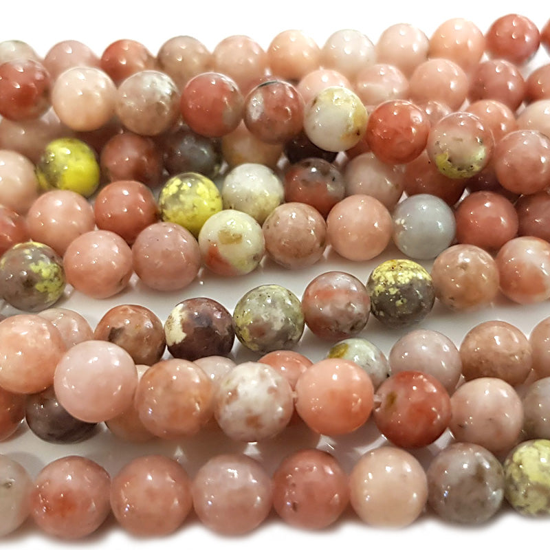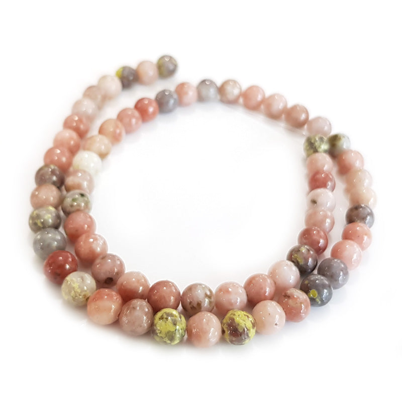 Pale shades of pink with earthy warm reddish brown tones. May also include mottled yellowy green with grey inclusions. Jasper generally contains organic material and mineral oxides which give it unique colours and patterns. Jasper is an opaque form of Chalcedony and is often multicoloured.