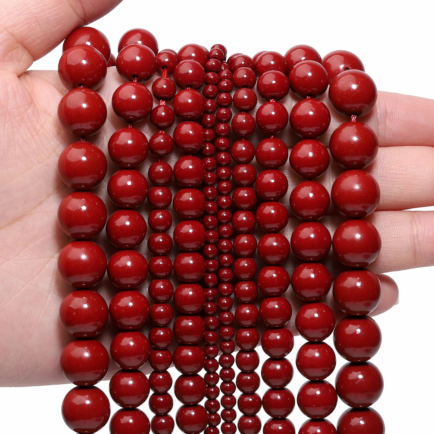 Cinnabar Jade Round Beads feature rich red to deep crimson tones with smooth, polished surfaces that bring warmth and visual impact to jewellery designs. Often used as a decorative stone, Cinnabar Jade is a jade-style material created from colour-treated stone chosen for its uniform shape and consistent finish.