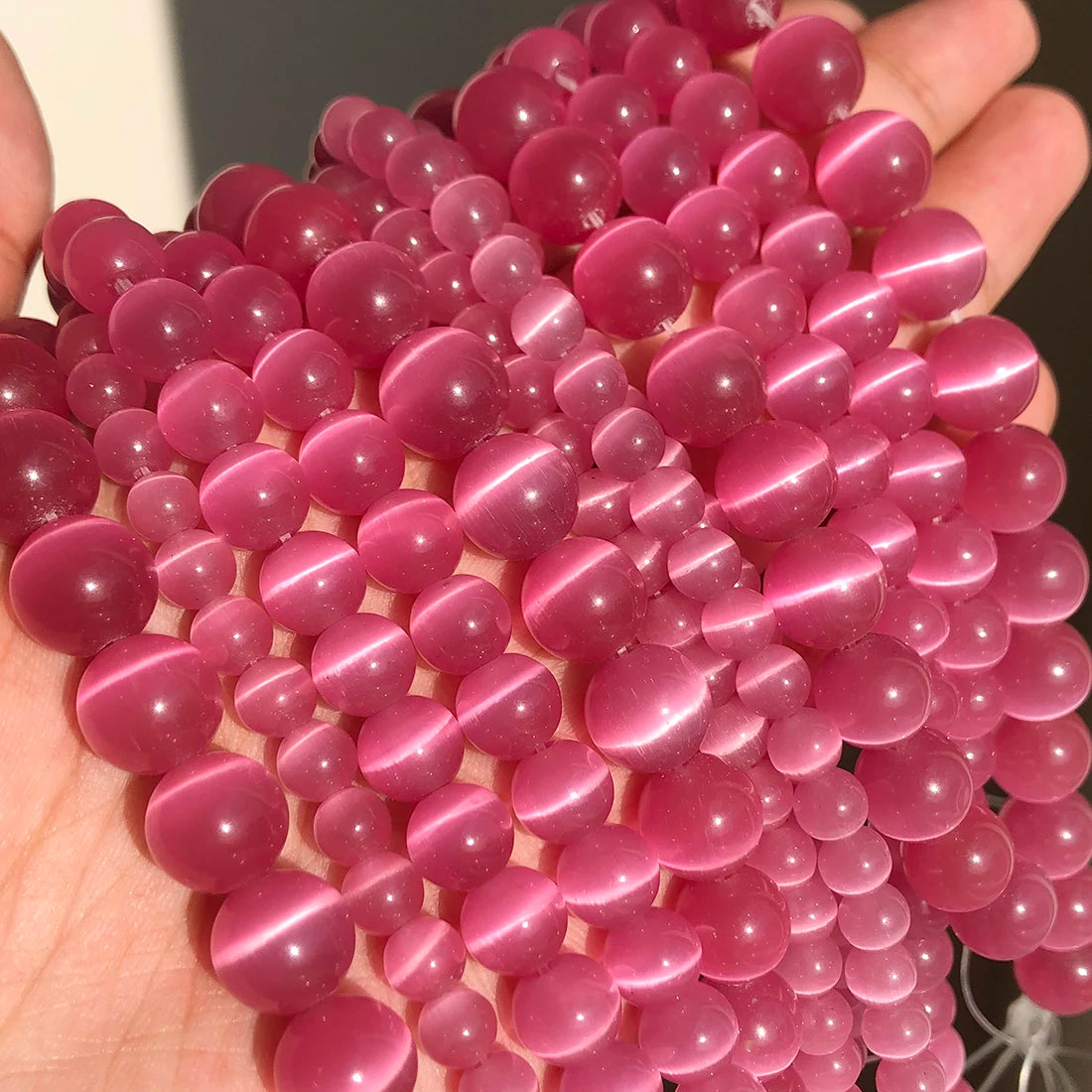 Glass Cat’s Eye beads are a man made bead created using fiber optic glass which, is usually used in the telecommunication industry. For this reason Cat’s Eye beads are also known as “Fibre Optic Beads”. These remarkable semi-translucent beads are composed in the way to create an amazing light refraction effect that shimmers with movement.