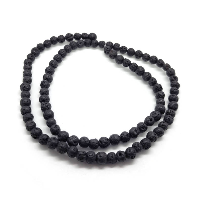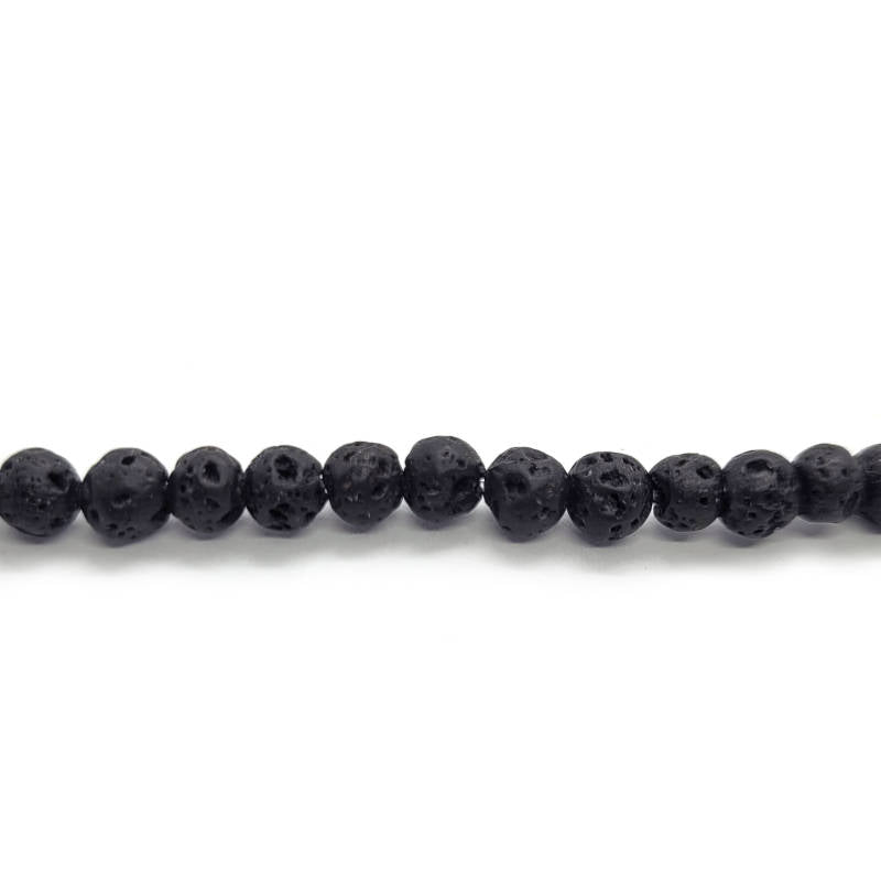 Lava rock beads are made of cooled molten lava. The Lava rocks are shaped and smoothed, leaving the small cavities characteristic to the stone. Lava rock beads are lightweight, smooth to the touch and smell a bit like a barbeque.