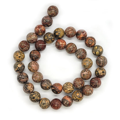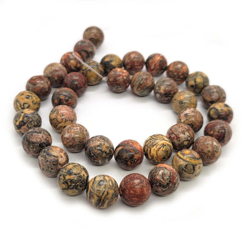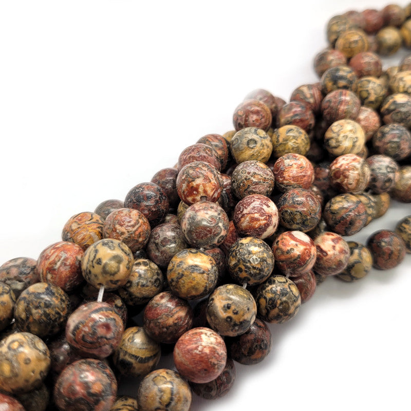 Leopardskin Jasper beads are varying colours of deep reds and pinks with mixes of green, cream and browns. As with all Jaspers, it is believed to be a protective stone. Also known as jaguar it is believed to have strong connections to nature. Jasper is a very durable stone.