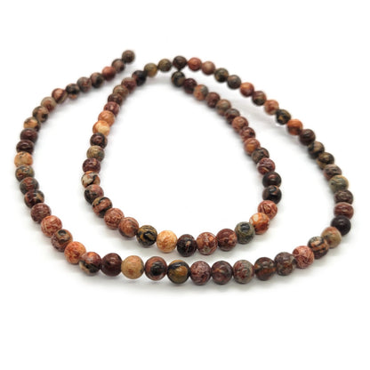 Leopardskin Jasper beads are varying colours of deep reds and pinks with mixes of green, cream and browns. As with all Jaspers, it is believed to be a protective stone. Also known as jaguar it is believed to have strong connections to nature. Jasper is a very durable stone.