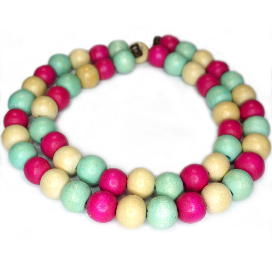 Natural White Wood beads. These beads have been finished in an industry standard wax coating leaving them smooth to touch and have a very subtle buffed sheen. Each strand contains a mix of dyed Hot Pink and dyed Turquoise beads as well as the un-dyed Natural white wood.