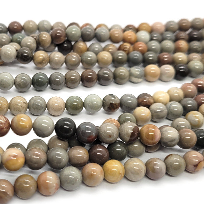 This stone is named for its Picasso like markings ans is believed to assist in creativity development. Also called Picasso Marble, is believed to have strong metaphysical qualities of grounding and calming. Beads range in colour from blue greys, greens and brownish reds. Please note that colours vary each strand and batch.