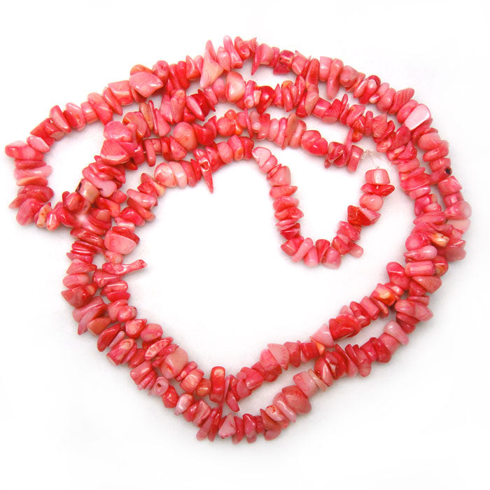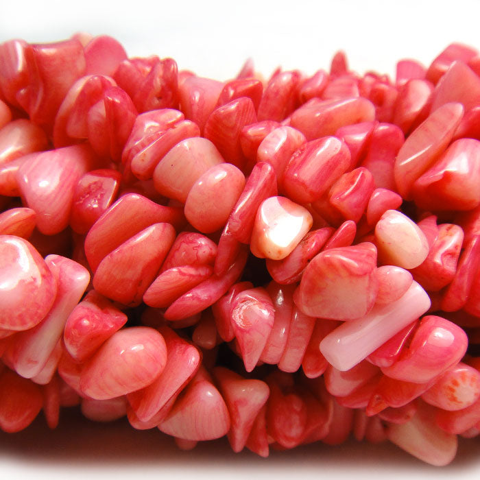 Pink Coral Gemstone Chips 5x8mm (~160pce Strand) - 91cm /36'" Strand. Precious coral or red coral is the common name given to "Corallium rubrum" Coral like Pearl is a biogenic precious stones. Both Coral and Pearl consists of calcium carbonate that has been deposited by various species of marine invertebrate.