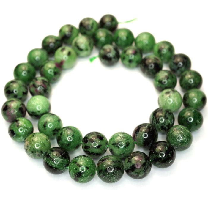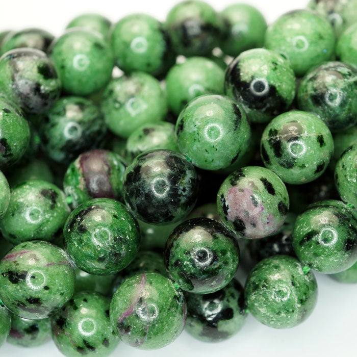 Sometimes referred to as “Ruby in Zoisite”, Zoisite is also known as Anyolite, a calcium aluminum hydroxy sorosilicate. Ruby Zoisite is a relatively new gemstone first being discovered in Tanzania back in 1954. The name Anyolite derives from the word for "green" in the native language of the Masai tribe. These natural opaque gemstone beads contain Zoisite/Anyolite (green), Tschermakite (black) and Ruby (red).