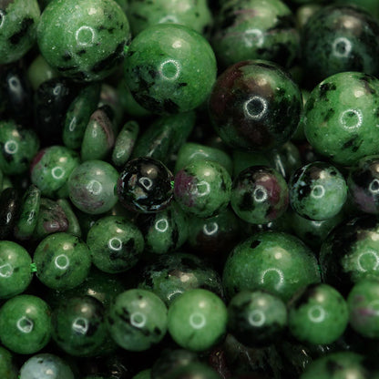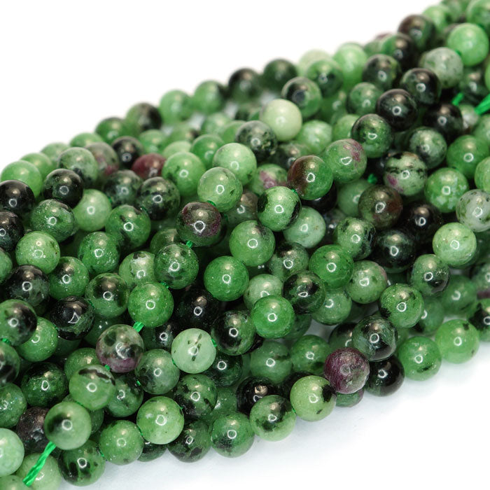 Sometimes referred to as “Ruby in Zoisite”, Zoisite is also known as Anyolite, a calcium aluminum hydroxy sorosilicate. Ruby Zoisite is a relatively new gemstone first being discovered in Tanzania back in 1954. The name Anyolite derives from the word for "green" in the native language of the Masai tribe. These natural opaque gemstone beads contain Zoisite/Anyolite (green), Tschermakite (black) and Ruby (red).