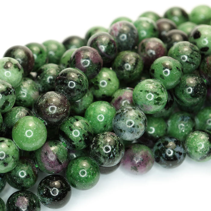 Sometimes referred to as “Ruby in Zoisite”, Zoisite is also known as Anyolite, a calcium aluminum hydroxy sorosilicate. Ruby Zoisite is a relatively new gemstone first being discovered in Tanzania back in 1954. The name Anyolite derives from the word for "green" in the native language of the Masai tribe. These natural opaque gemstone beads contain Zoisite/Anyolite (green), Tschermakite (black) and Ruby (red).