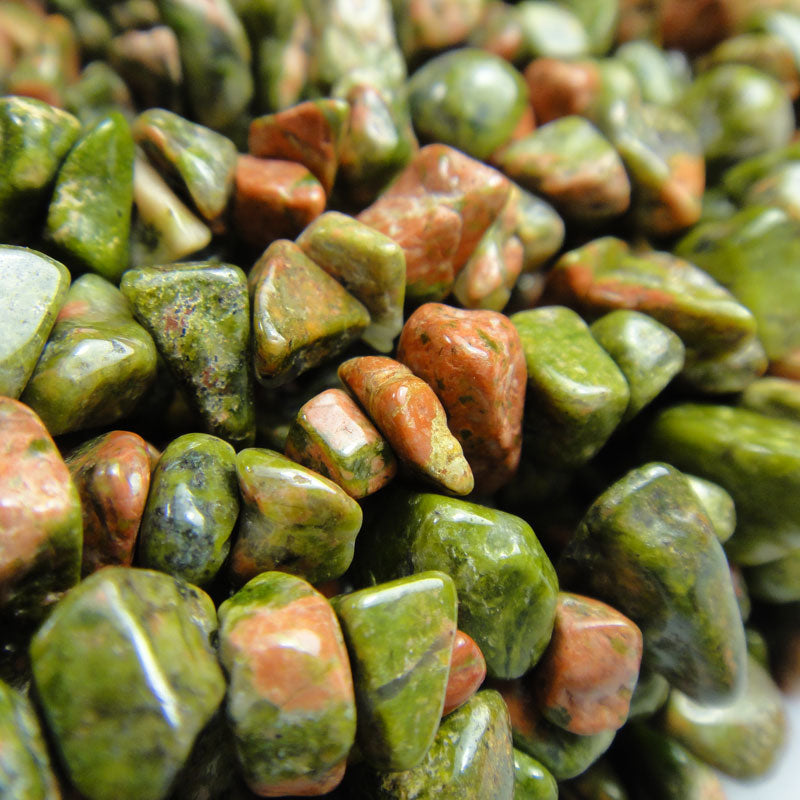 Unakite is named after where it was first discovered, in the Unakes Mountains oin North Carolina. It is composed of pink orthoclase feldspar, green epidote and quartz. Unakite beads are considered to be balancing and said to be an excellent stone for unifying emotional, mental and spiritual aspects.